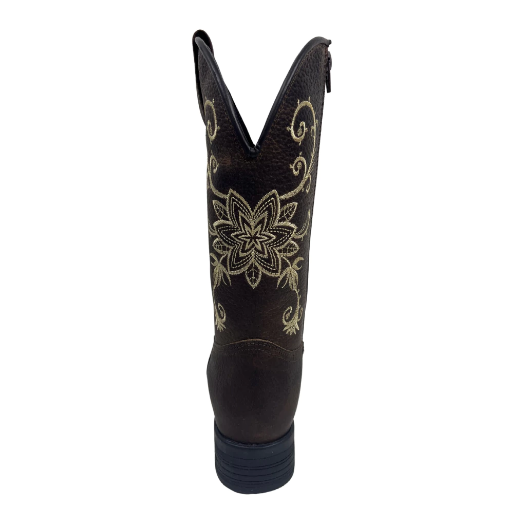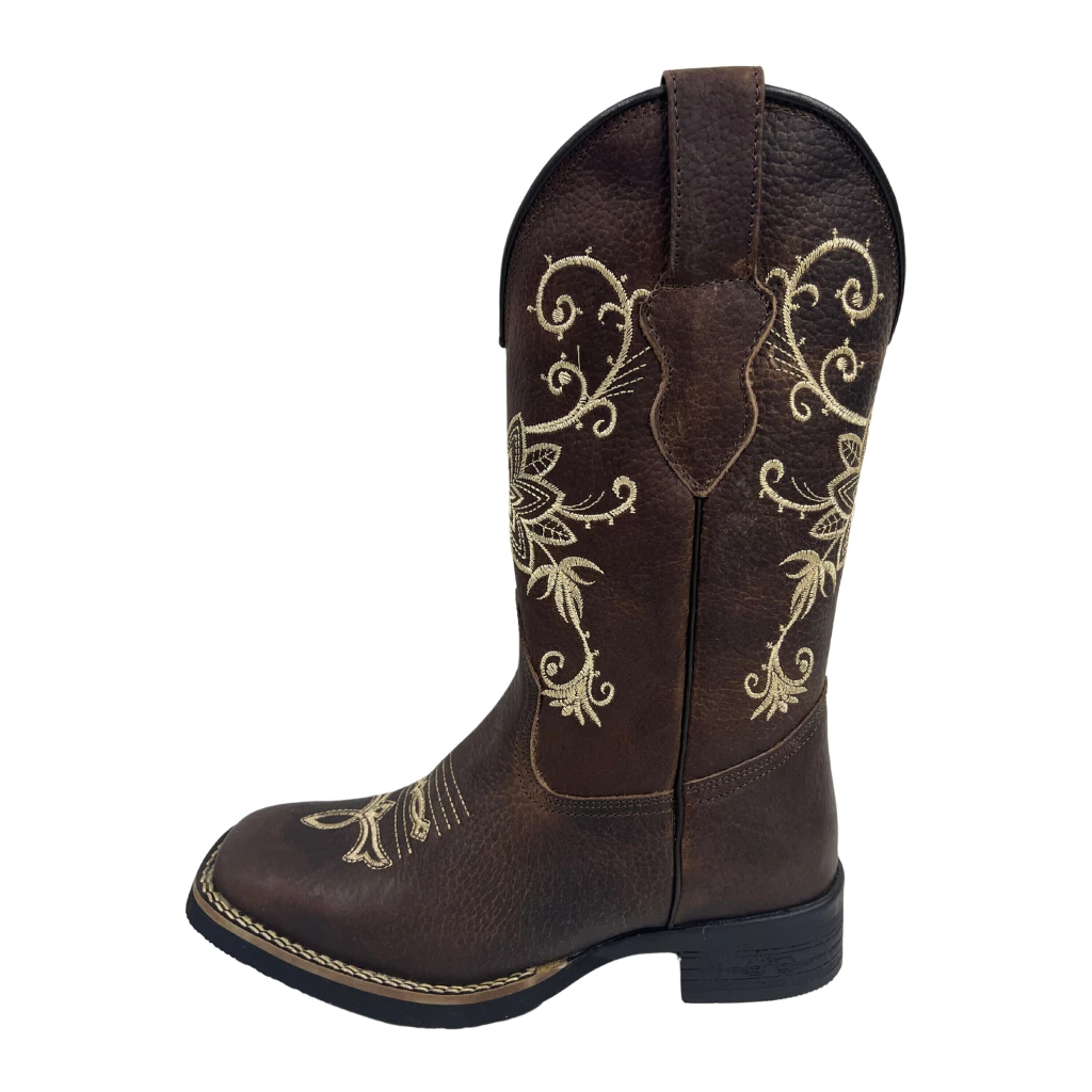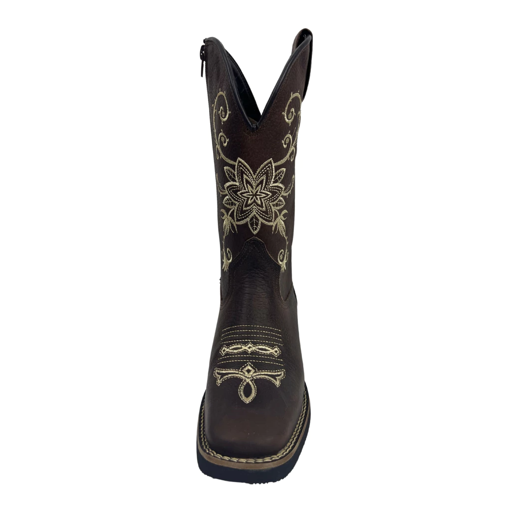 Bota fabricada em couro legitimo bovino. Pé na cor Malboro Castanho com bordado em alta definição. Cano alto na cor Malboro Castanho e bordado em alta definição. Possui ziper na parte interna do cano para facilitar ao calçar. Bico quadrado estreito. Solado em borracha com uma costura e salto de aproximadamente 4cm.