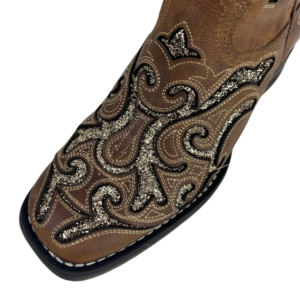 Bota fabricada em couro legitimo bovino. Pé na cor Dallas Tabaco com recorte em manta de gliter bronze, com bordados e aplique e taxinhas.
