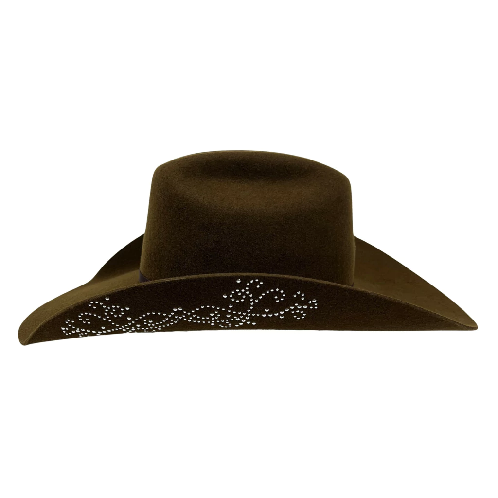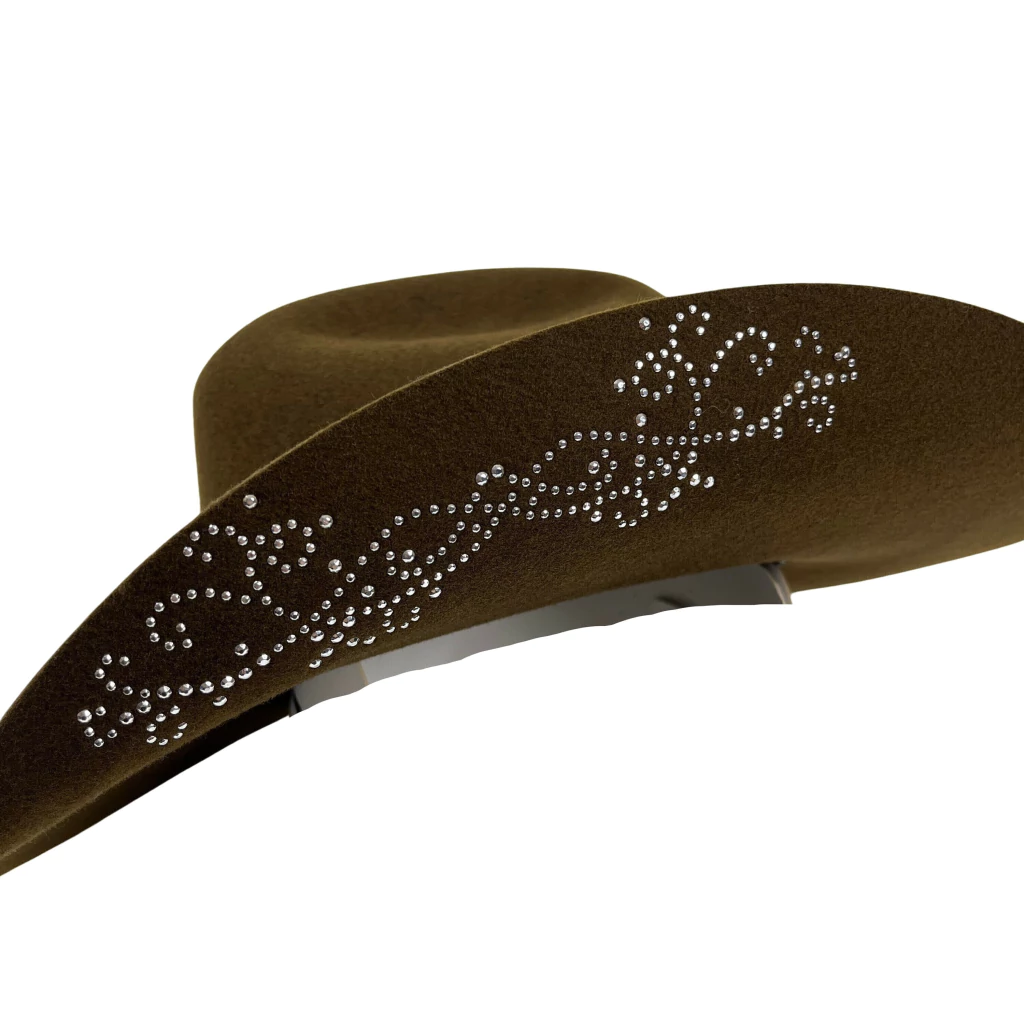 Confeccionado em feltro de alta qualidade 100% lã na cor Café; Banda em fita de nylon com pingente PRALANA em metal; Aplique de Strass na cor prata na parte de baixo da aba.